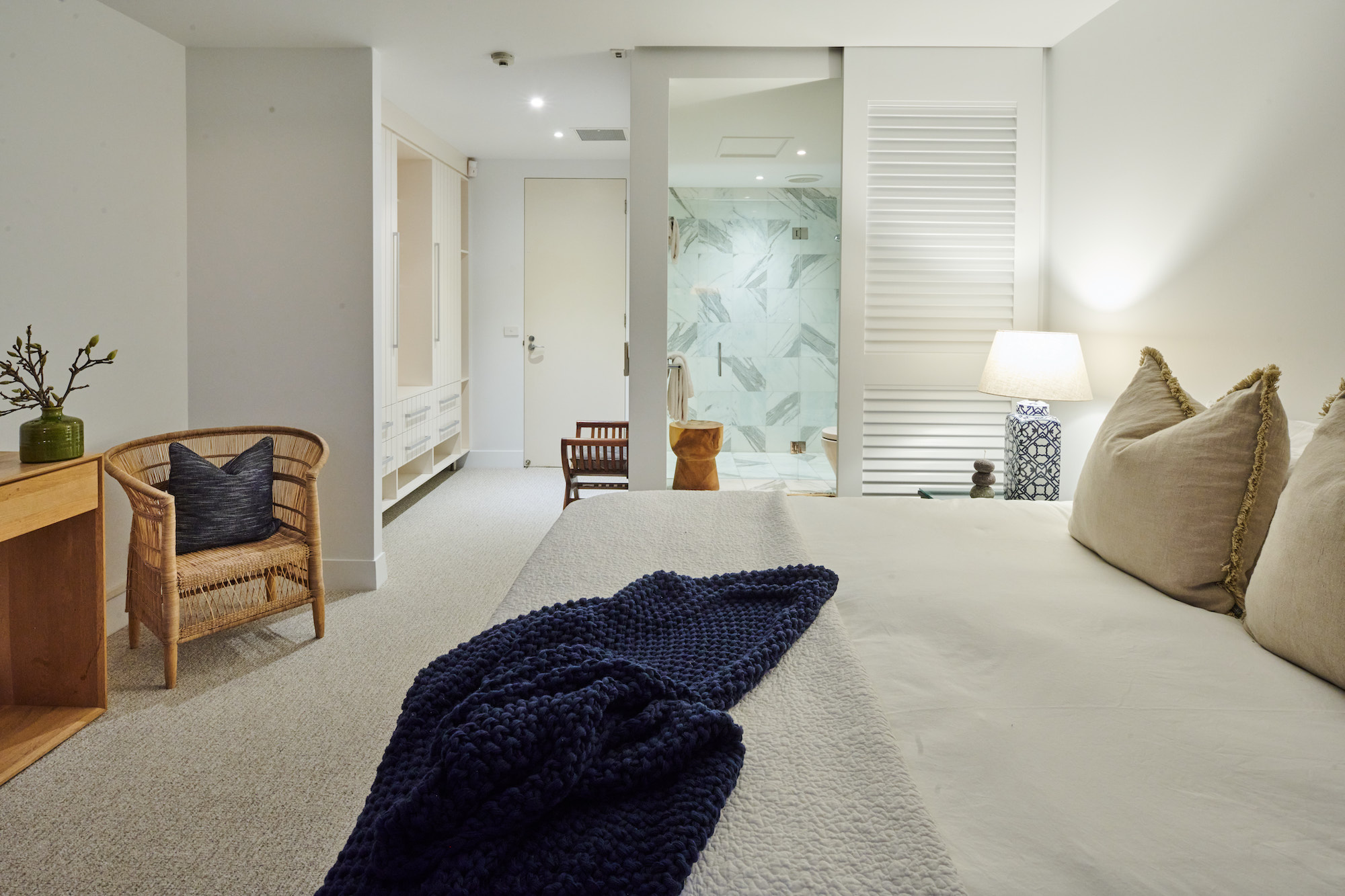 Located on the top floor, the Panorama Ocean Suite two bedroom offers stunning views of Wategos Beach. This luxurious, light-filled suite is individually designed and features two bedrooms, two bathrooms, and a separate living and dining area. Each bedroom includes a comfortable king-size bed with elegant Frette bed linen.